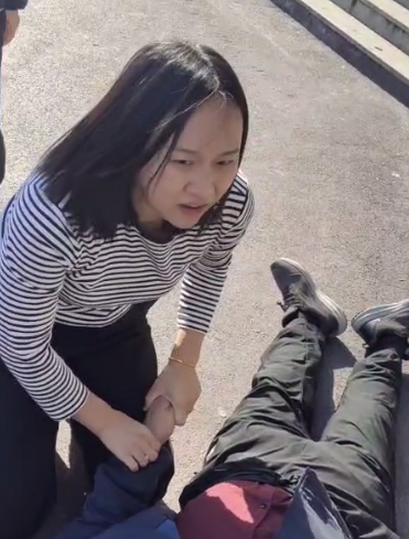 旁边一位热心女士见状,主动帮她接过了孩子。此时老人已失去意识,这位年轻医生迅速跪地,轻拍老人双肩并大声呼唤,同时检查是否有咬舌风险。